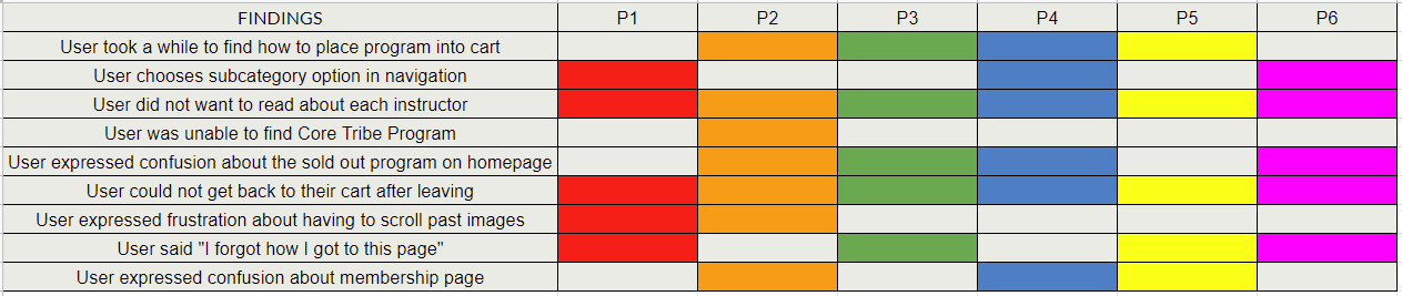 As we prepared to begin our user interviews, we shared a Google Sheet with observations written in the left-hand column within our team. After we completed the walkthroughs with two female users, we colored in the row with their assigned color and shared it with our stakeholder, Layne. The visual representation of the findings this type of report provides helped her quickly understand any pain points we uncovered.